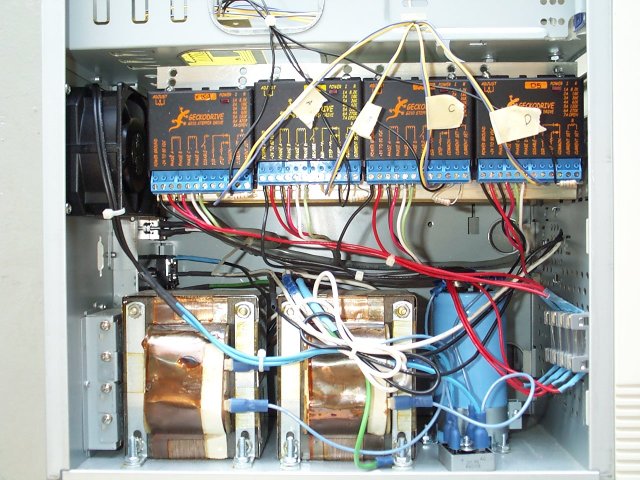 drivers and power supply. The drivers are from Gecko. They are all model G210. The G210 model allows several different microstepping modes. I use three motors for single stepping and one set at 10 microsteps per step out of convenience since I have one project that requires microstepping (the Egg Mill) and most others do not. The power supply components were purchased from Camtronics Inc and include two transformers hooked in series, a bridge rectifier, and a giant 18000 microfarad capacitor. A bleed resistor is installed across the capacitor terminals to safely bleed off the enormous charge that gets built up in the capacitor. Each stepper driver gets a dedicated 5 A slow blow fuse. The fan pulls air through the large heat sink that the Gecko drives are attached to rather than pushing it through to cut down on inefficient swirl |