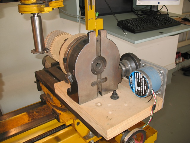The machine used to cut the gear teeth is a Shoptask Bridgemill 3 in 1 machine. The gear cutting tools were purchased from Travers. I purchased cutters for 10 pitch involute gear teeth in sizes 3, 5, and 8 for the different numbers of gear teeth. The Arbor is from KBC Tools and fits in a 3/4" R8 collet. 4 gears are being cut in the operation shown with MDF sacrificial material on front and back. The gear blank is pushed past the rotating cutter after being indexed on the horizontally mounted rotary table. The gear shown is a 43 tooth gear. |