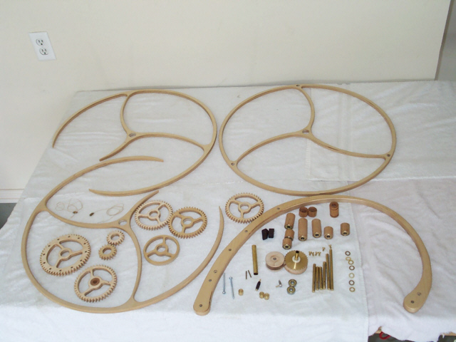 -HOME -Clockworks ...Grasshopper Clockwork ...Inertia Clockwork .........Gear Cutting .........Sample Gears .........Rotary Table .........Parts Disassembled .........Escapement Revealed ...Simplicity Clockwork ...Gear Machine Clockwork ...Concentricity Clockwork -Eggs ...Egg Drawing Machine ...Brown Eggs ...Green Eggs ...Fun With Trigonometry -CNC ...The Milling Machine ...Inside the Controller Case ...Rear of Controller Case ...The Interface Board -ProTrac Support | All of the parts ready for re-assembly after finishing the wooden parts with tung oil and paste wax. |