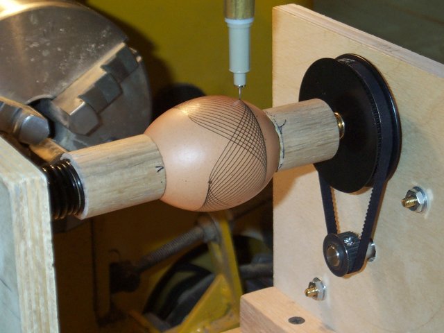 The egg mill consists of a rack mounted to the XY table of a Shoptask Bridgemill 3 in 1 machine. Attached to the other side of the small pulley in the picture is a 200 step per revolution stepper motor that is electronically converted to 2000 steps per revolution. The pen floats inside two concentric brass cylinders mounted in the mill spindle. The weight of the pen allows the pen to always be in contact with the egg. A CNC program using KCAM software rotates the egg while the Y table moves the egg along it's axis. The spring visible on the right maintains constant pressure on the egg. Gecko stepper motor drivers have signals sent from a PC. |